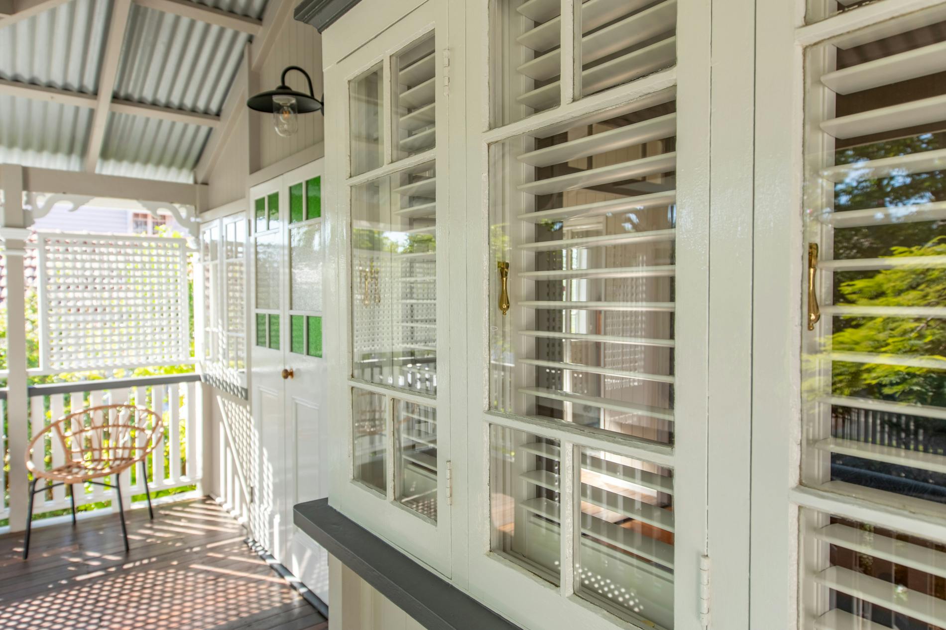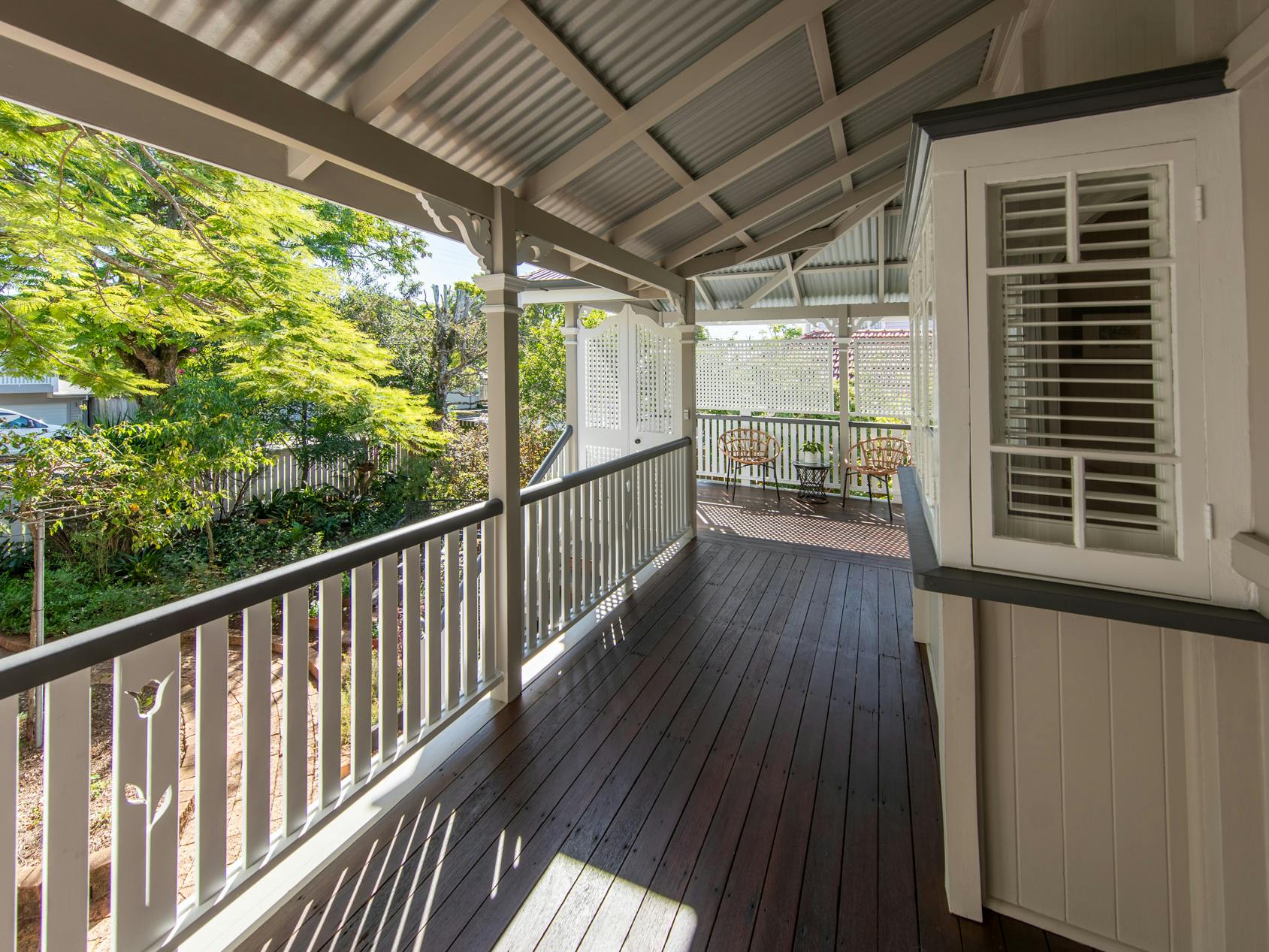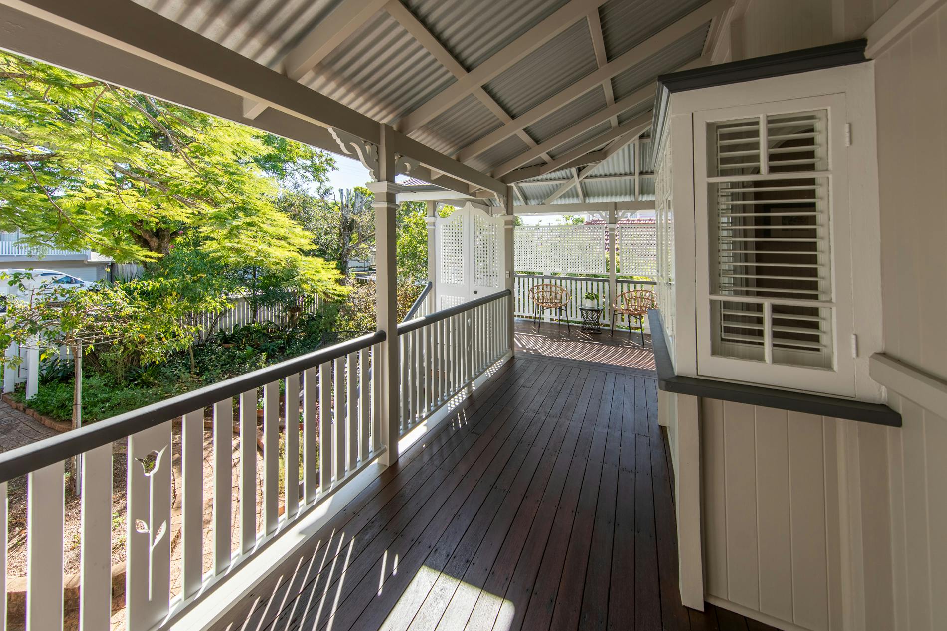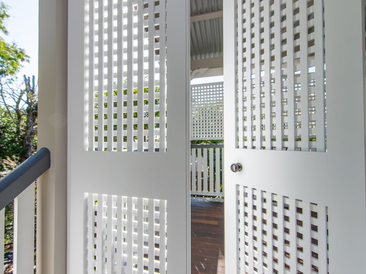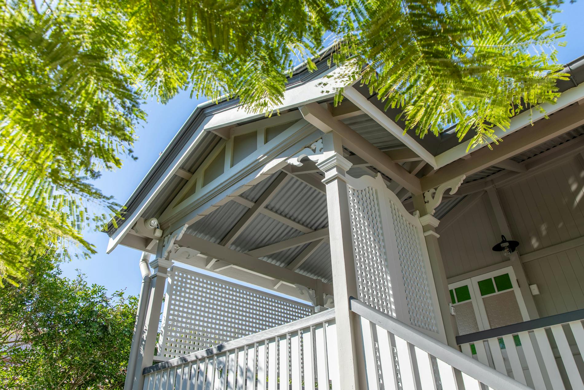 Throughout this job we paid special attention to the age of the house. Being almost 100 years old, the house was very detailed, and contained original timber in many areas that we carefully prepared and primed before painting. True to its age and the architectural styles of the 1920s, there were many intricate aspects of the house that we painted. This included the batten sweeps, stair railings with carved flower designs, detailed iron door frames, window frames, intricate lattice work, balcony rafters, gables, and French doors. Throughout the project, we also painted the fascia, gutters, and awnings which required height access. For this we utilised scaffolding to safely reach these areas. In addition, we completed a full repaint on the carport of the house, including the garage door, and we also prepared and recoated all the decking around the house’s exterior.