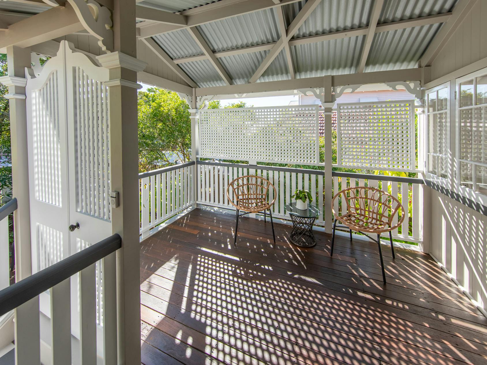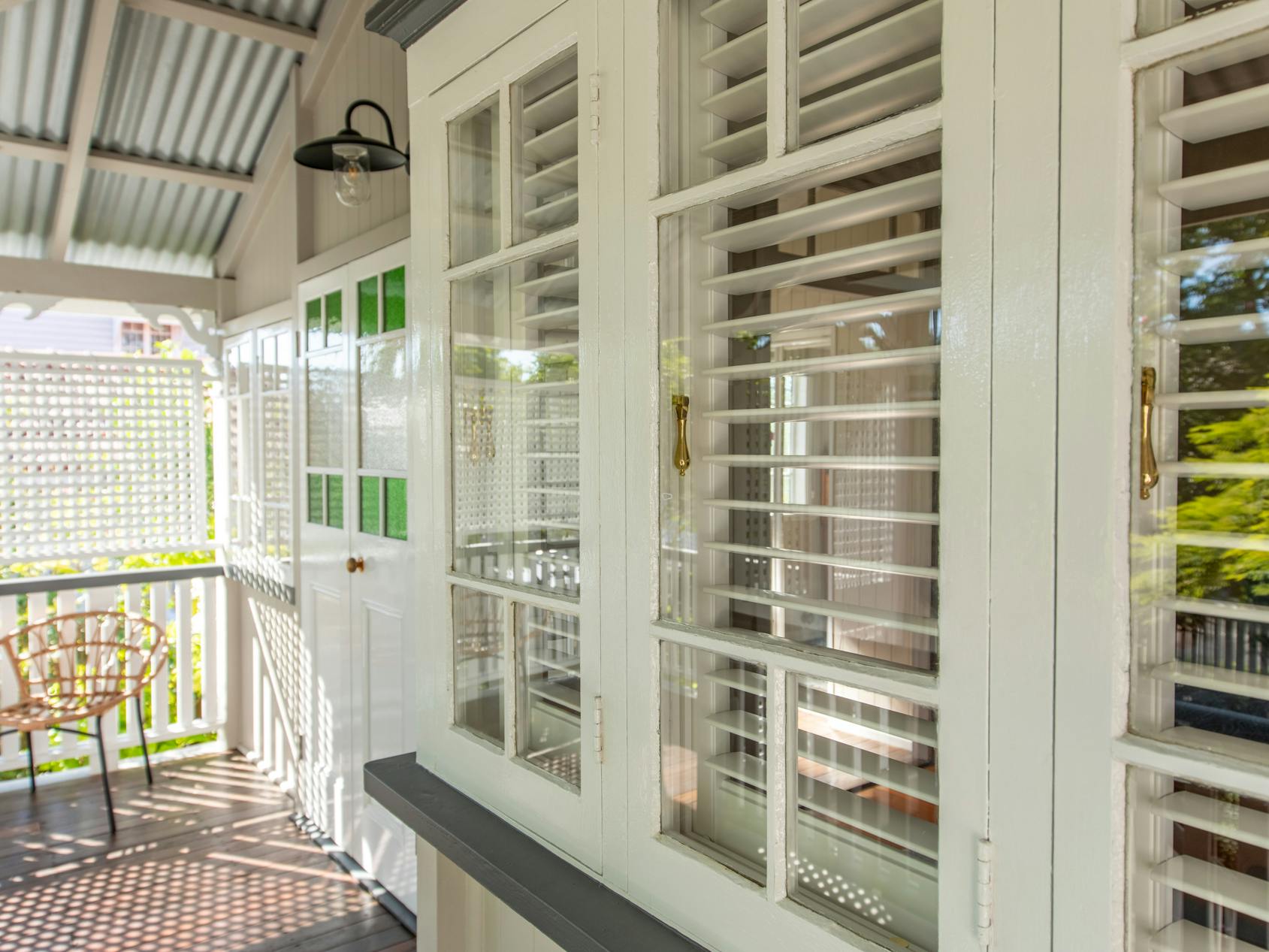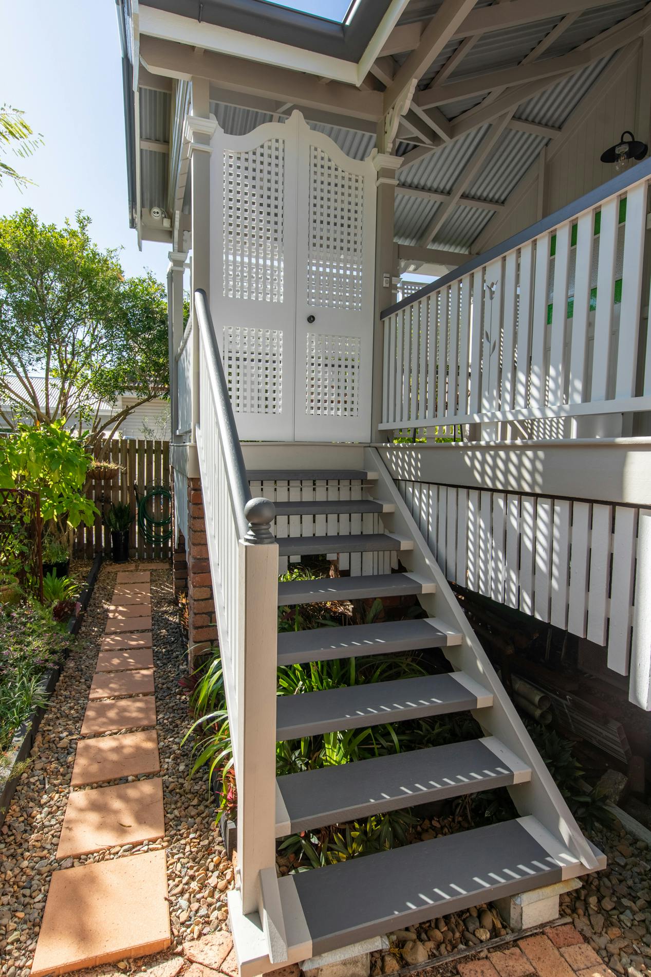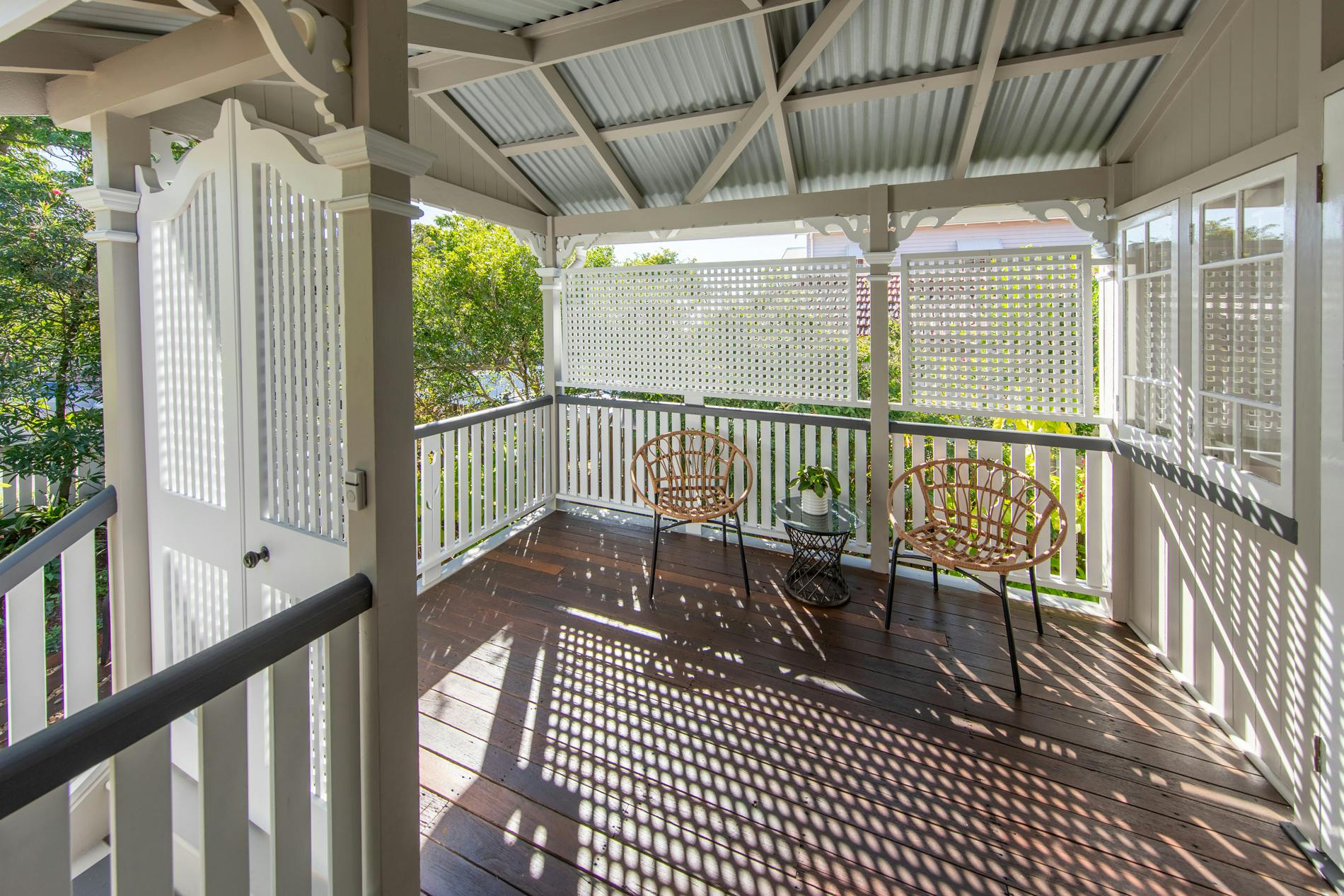 Throughout this job we paid special attention to the age of the house. Being almost 100 years old, the house was very detailed, and contained original timber in many areas that we carefully prepared and primed before painting. True to its age and the architectural styles of the 1920s, there were many intricate aspects of the house that we painted. This included the batten sweeps, stair railings with carved flower designs, detailed iron door frames, window frames, intricate lattice work, balcony rafters, gables, and French doors. Throughout the project, we also painted the fascia, gutters, and awnings which required height access. For this we utilised scaffolding to safely reach these areas. In addition, we completed a full repaint on the carport of the house, including the garage door, and we also prepared and recoated all the decking around the house’s exterior.