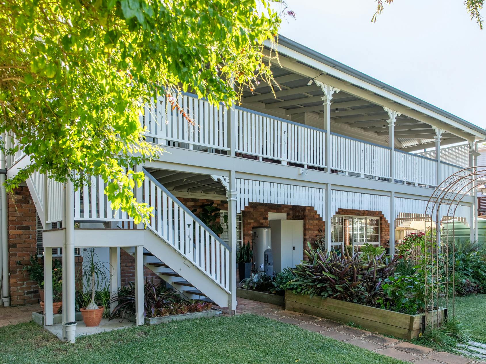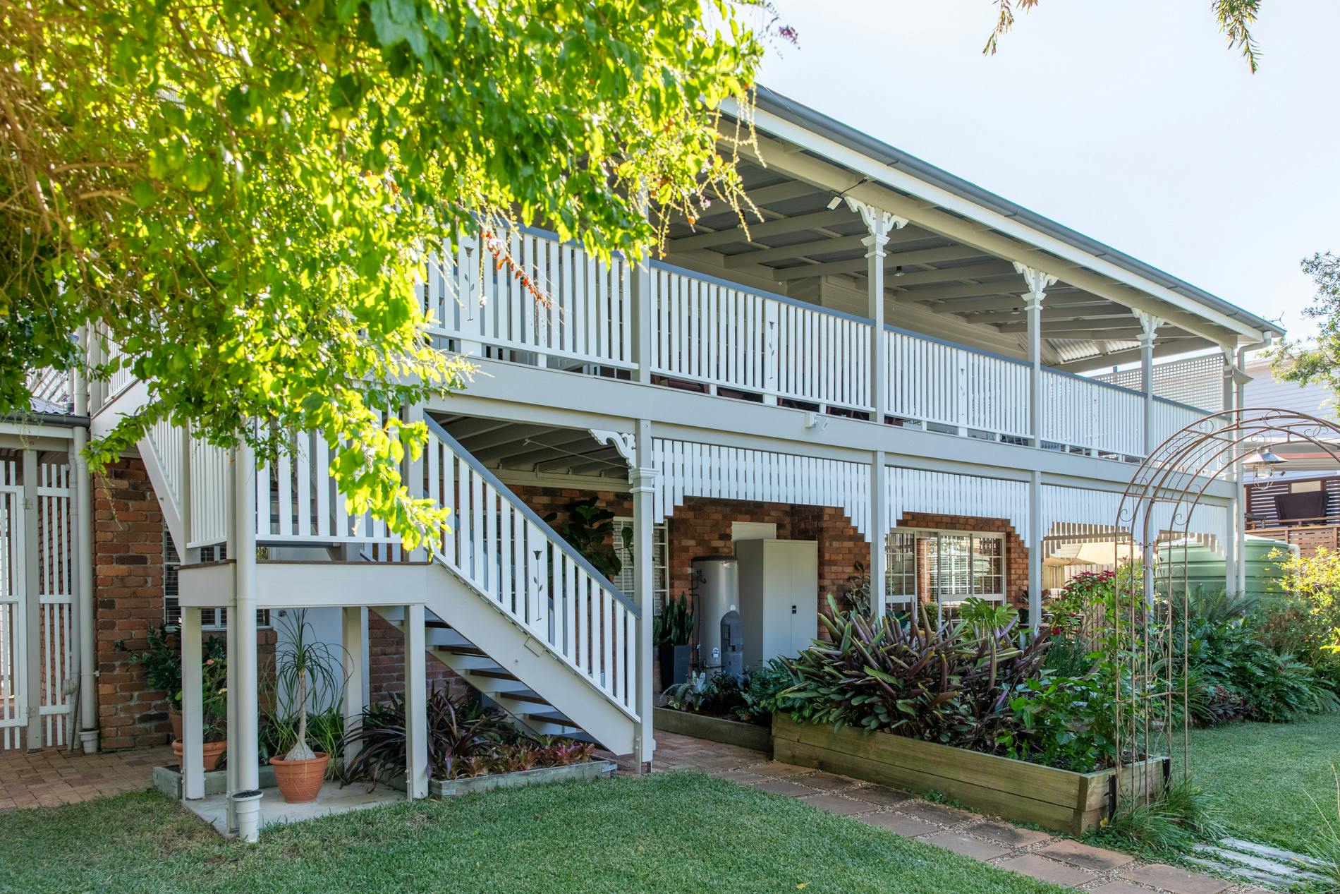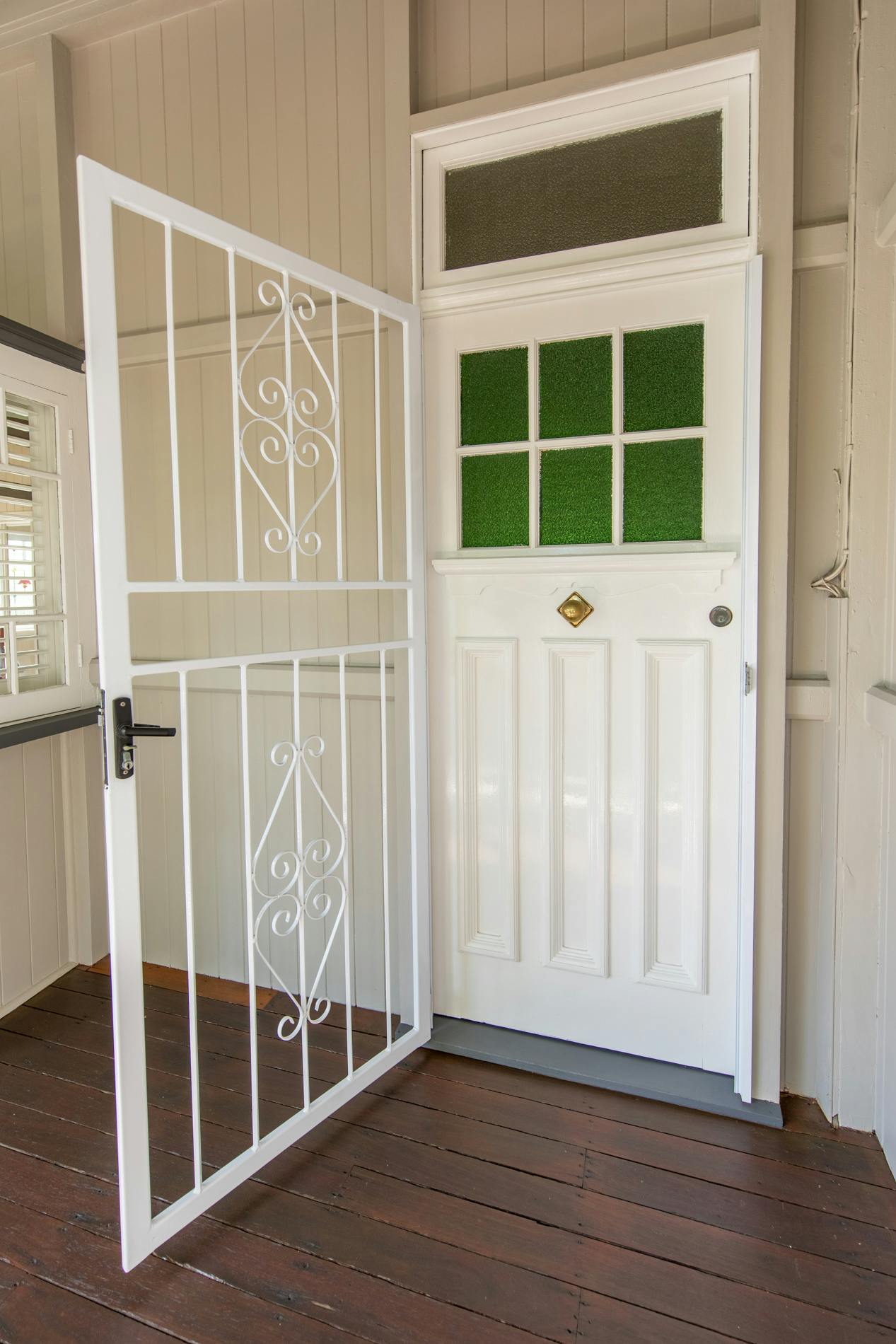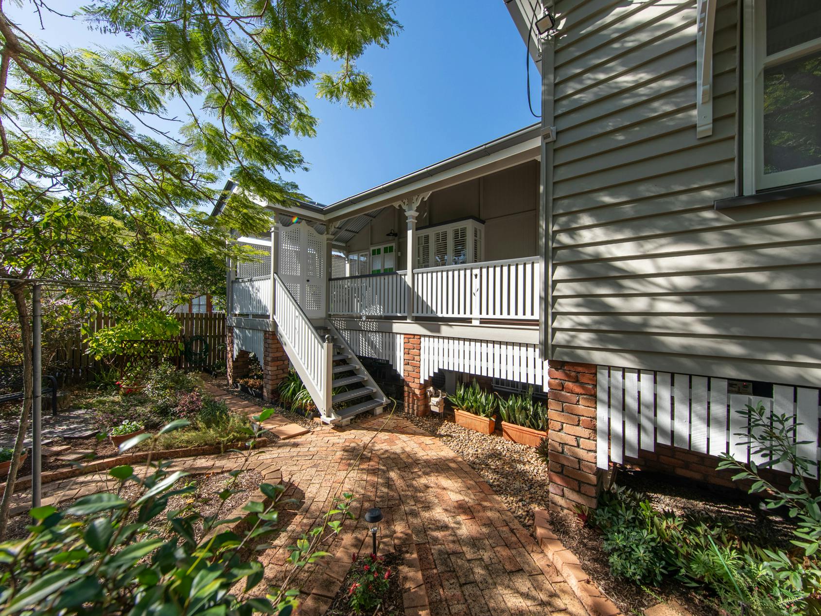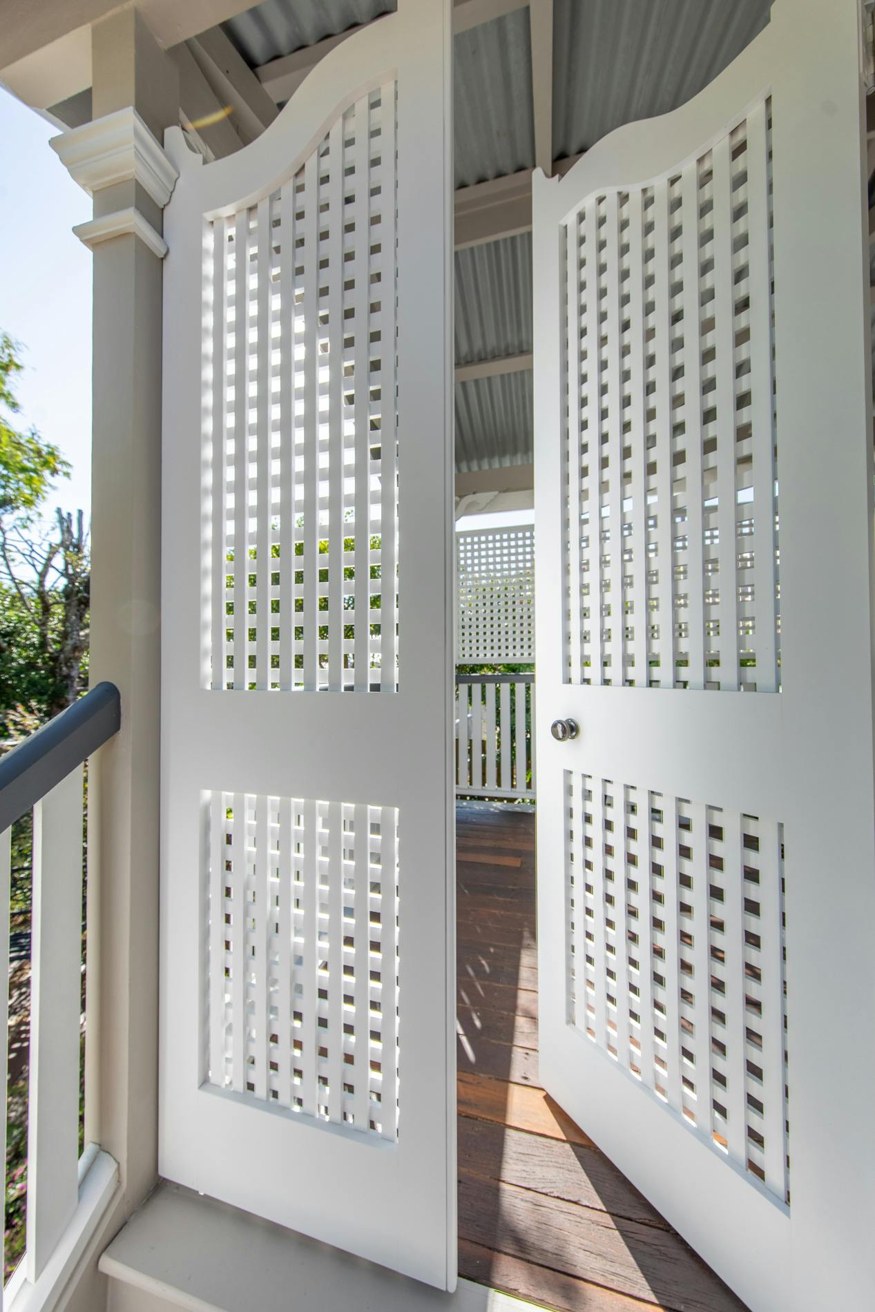 Throughout this job we paid special attention to the age of the house. Being almost 100 years old, the house was very detailed, and contained original timber in many areas that we carefully prepared and primed before painting. True to its age and the architectural styles of the 1920s, there were many intricate aspects of the house that we painted. This included the batten sweeps, stair railings with carved flower designs, detailed iron door frames, window frames, intricate lattice work, balcony rafters, gables, and French doors. Throughout the project, we also painted the fascia, gutters, and awnings which required height access. For this we utilised scaffolding to safely reach these areas. In addition, we completed a full repaint on the carport of the house, including the garage door, and we also prepared and recoated all the decking around the house’s exterior.