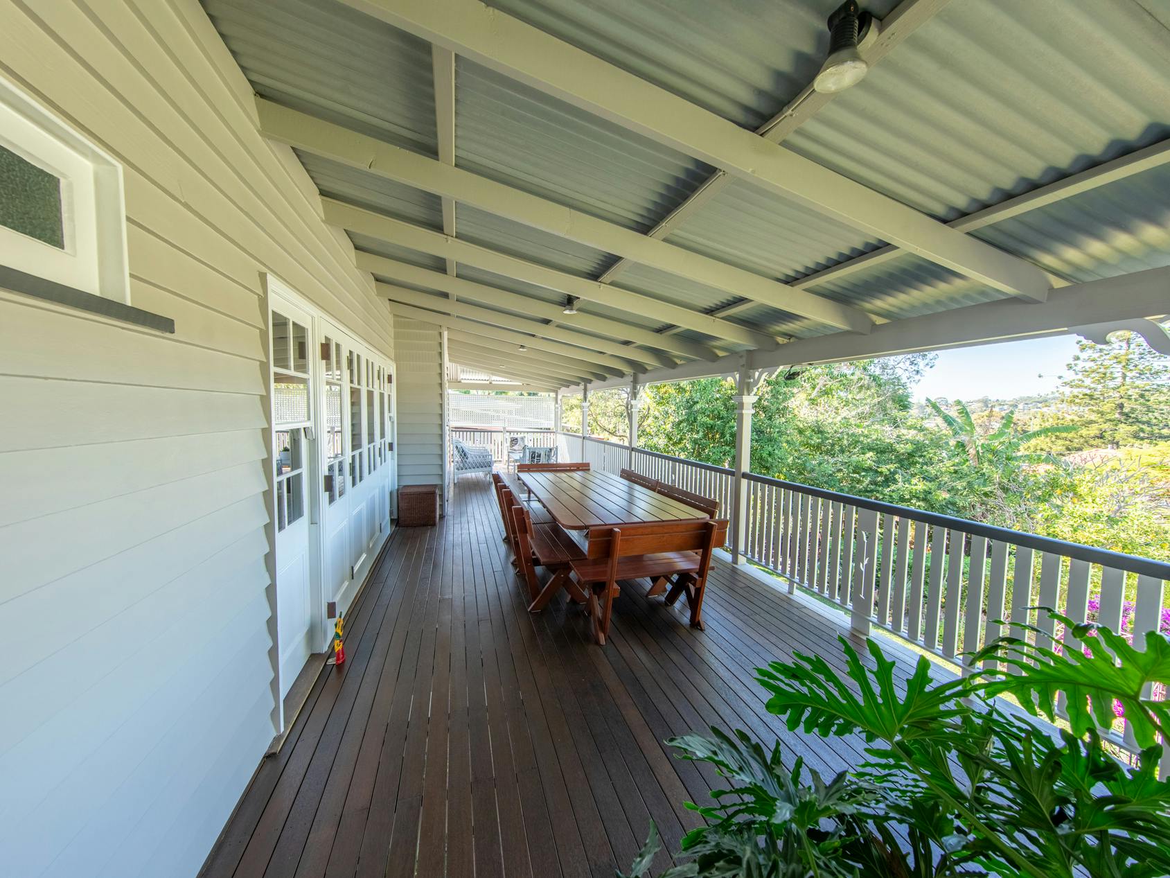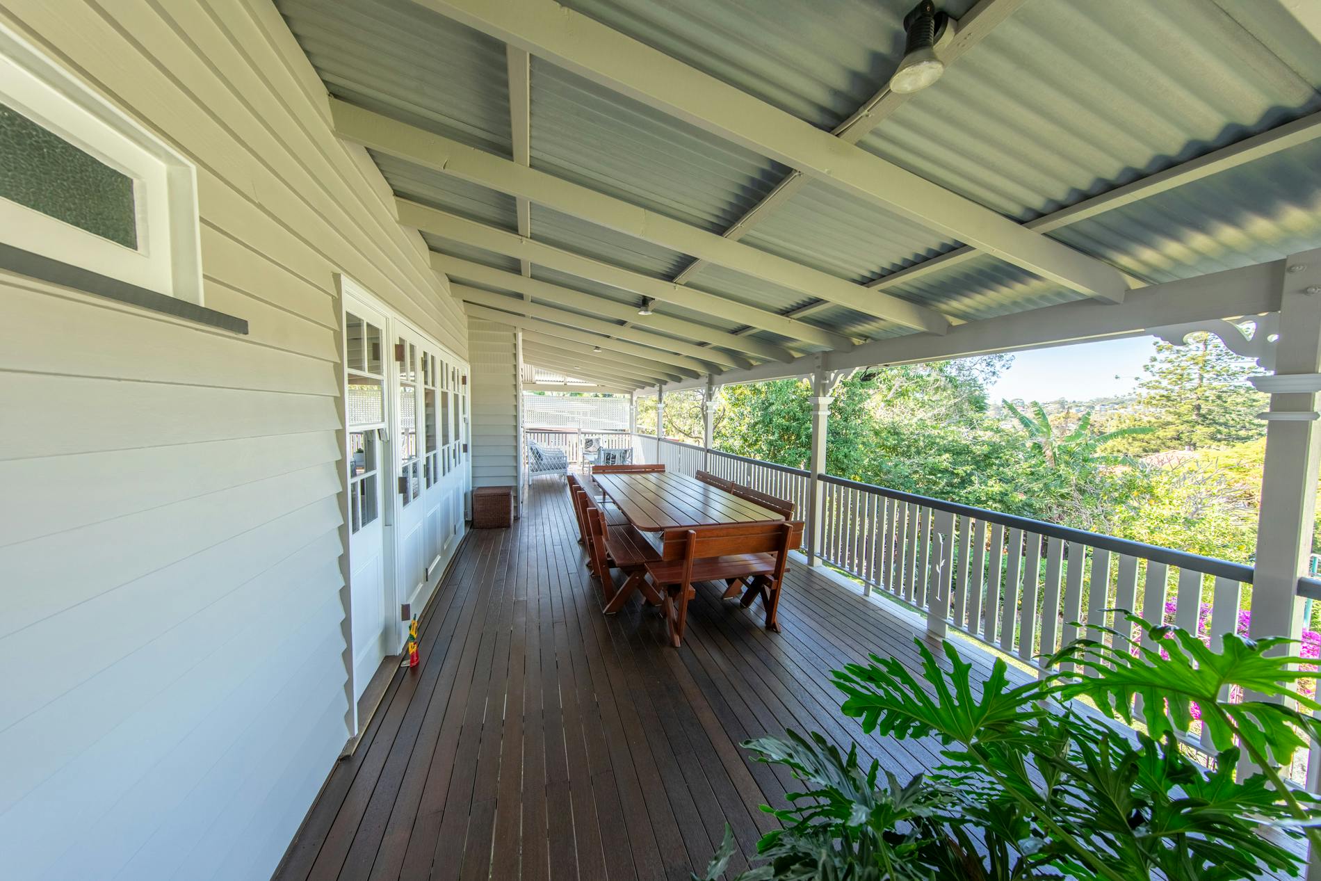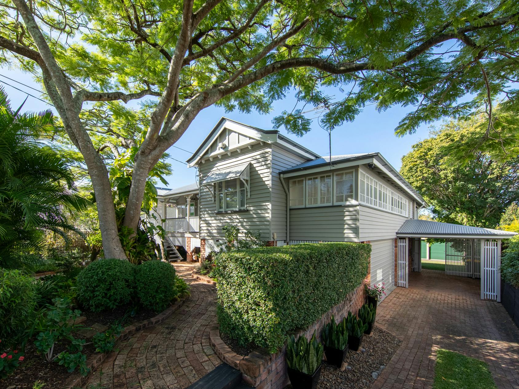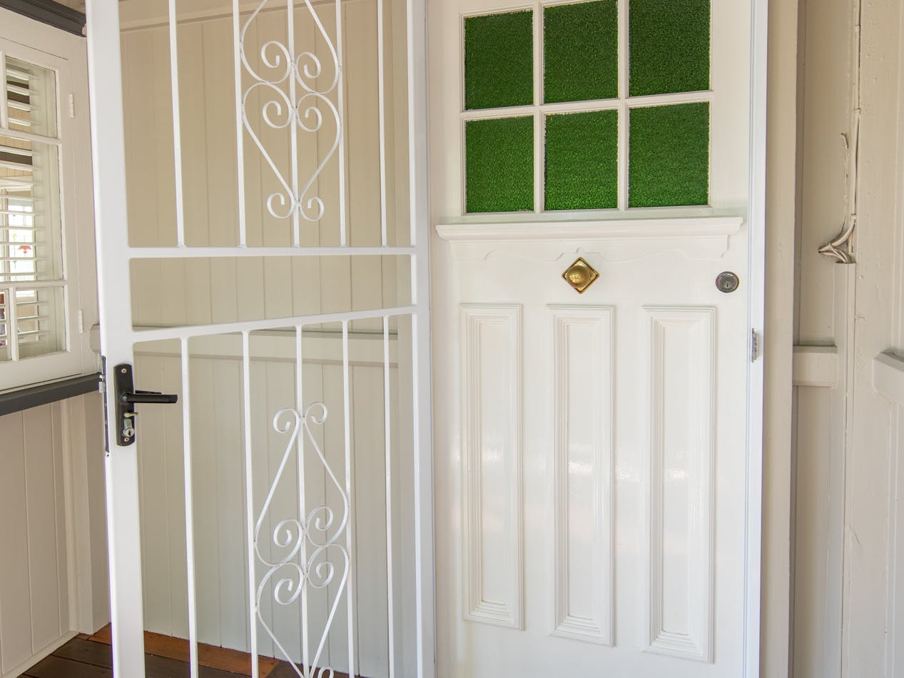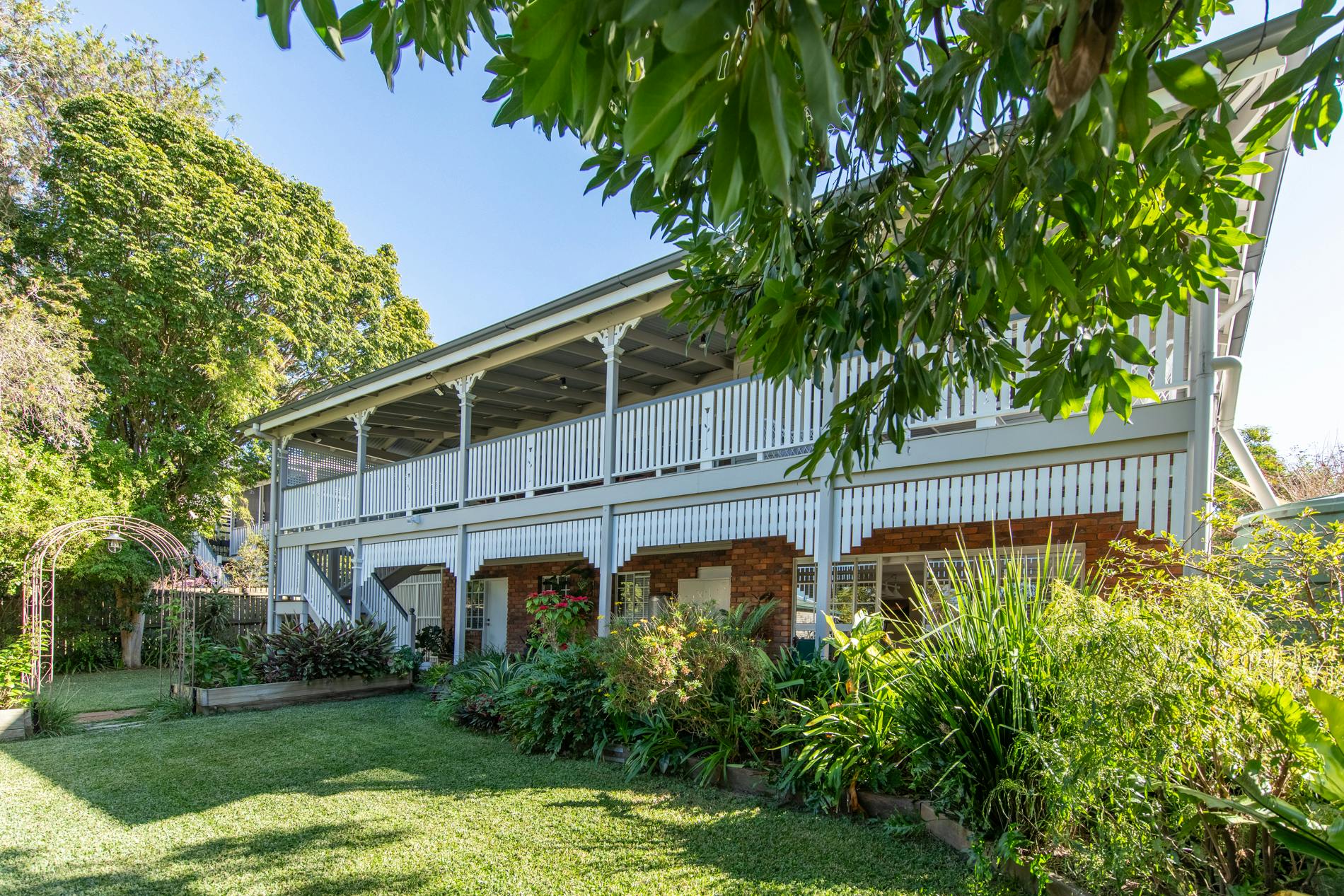 Throughout this job we paid special attention to the age of the house. Being almost 100 years old, the house was very detailed, and contained original timber in many areas that we carefully prepared and primed before painting. True to its age and the architectural styles of the 1920s, there were many intricate aspects of the house that we painted. This included the batten sweeps, stair railings with carved flower designs, detailed iron door frames, window frames, intricate lattice work, balcony rafters, gables, and French doors. Throughout the project, we also painted the fascia, gutters, and awnings which required height access. For this we utilised scaffolding to safely reach these areas. In addition, we completed a full repaint on the carport of the house, including the garage door, and we also prepared and recoated all the decking around the house’s exterior.