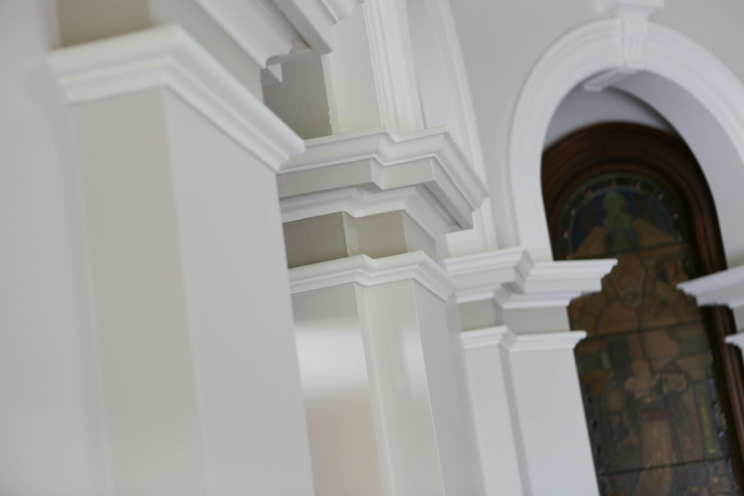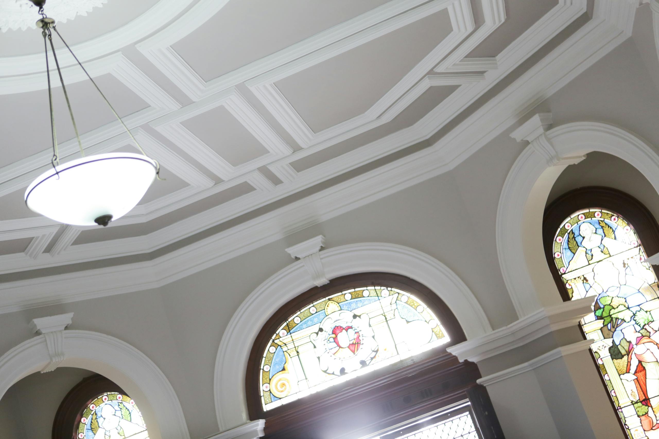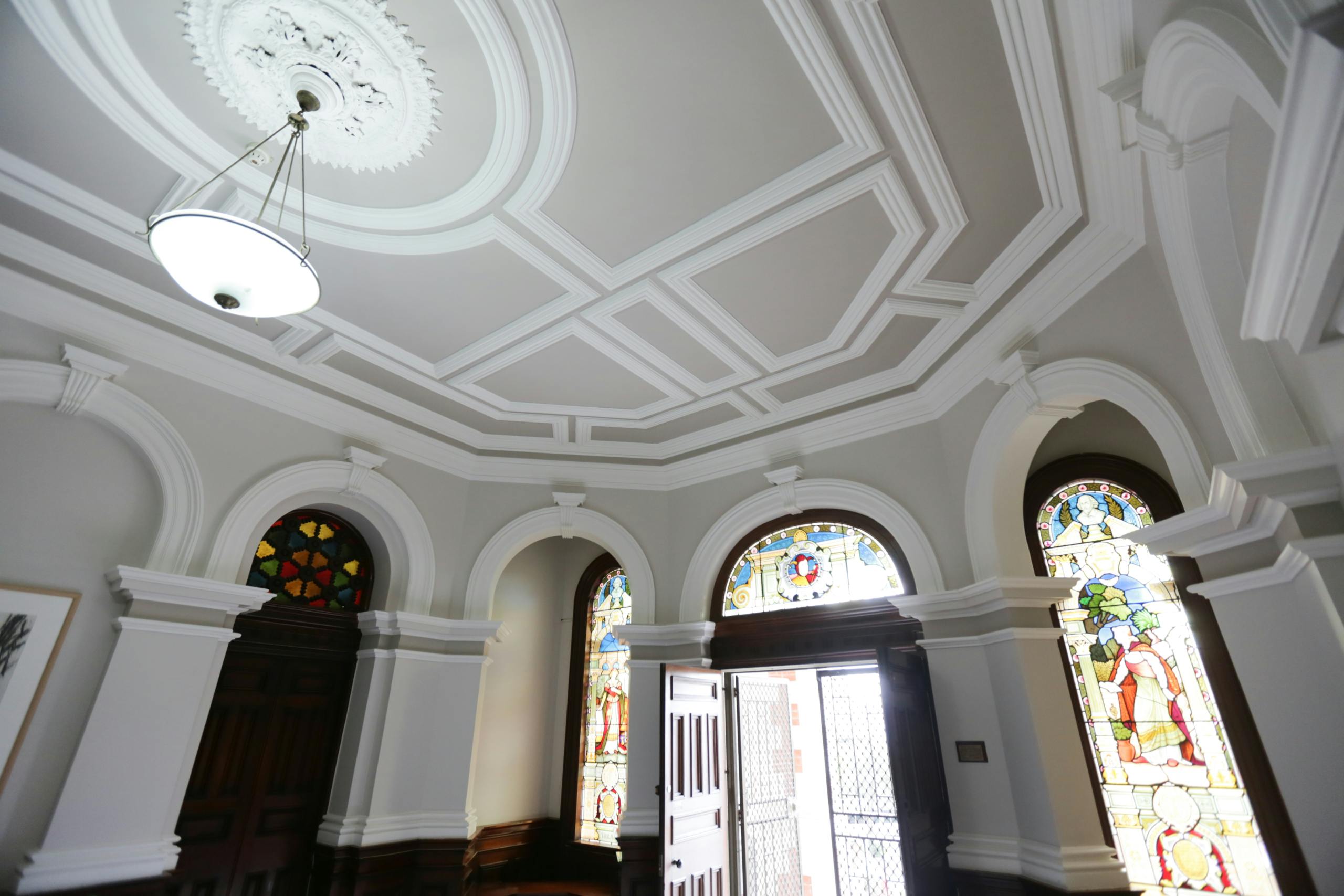 Over the years we’ve provided the school with quotes for different exterior and interior areas. One portion of work completed saw us painting the beautiful and ornate ceilings throughout the main building. Like on all of our many successful jobs we teamed up with a colour consultant from Rochele Decorating to give the client a colour scheme options. The options given were a simple and natural light choose or an option of out of the box. The client chose the out of the box option which resulted in the beautifully contrasted look of creamy white decorative molding against a darer grey. It was a brave choice by the school but the result is a breathtaking display of class which compliments the high ceilings, stained glass elements and dark wooden features.