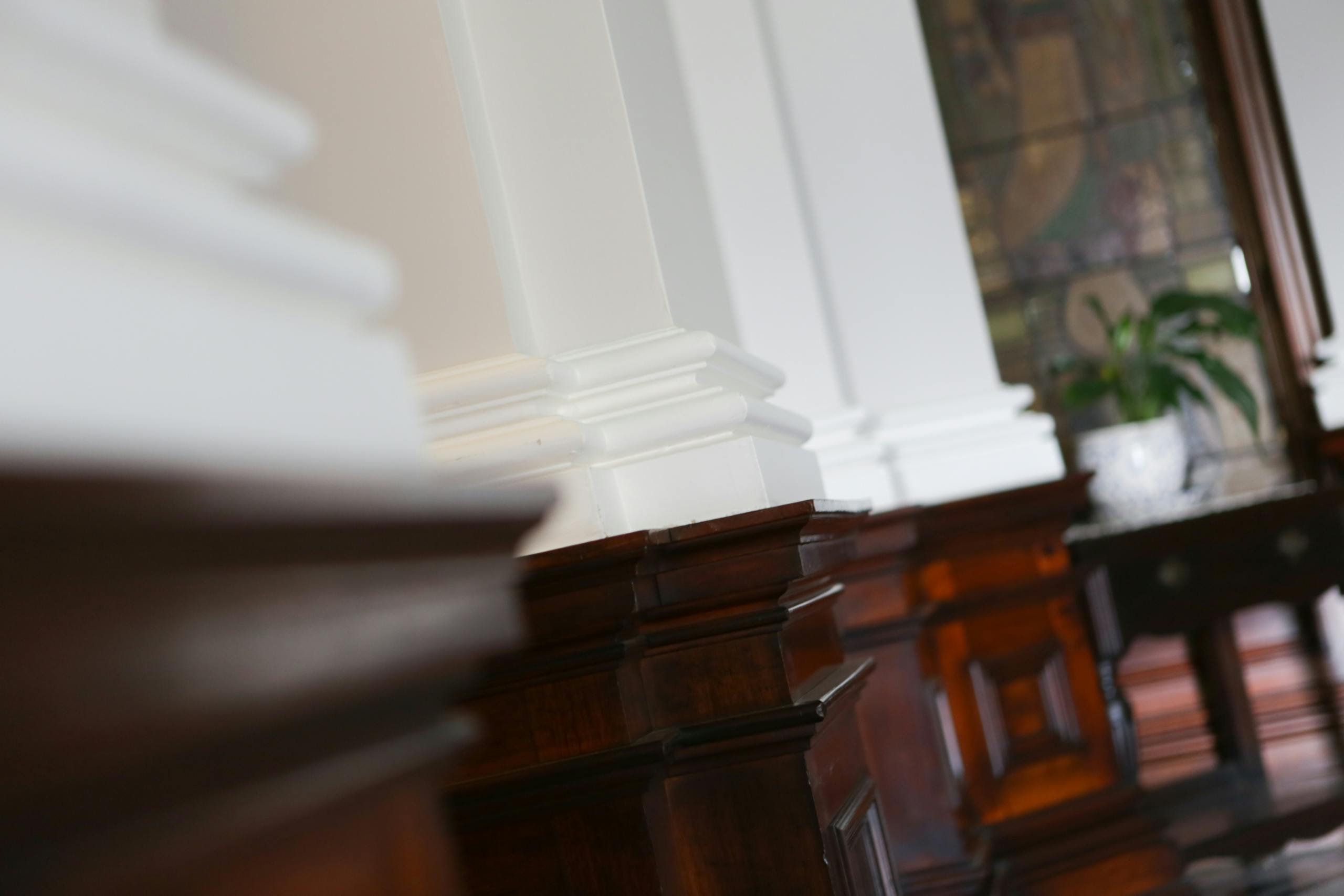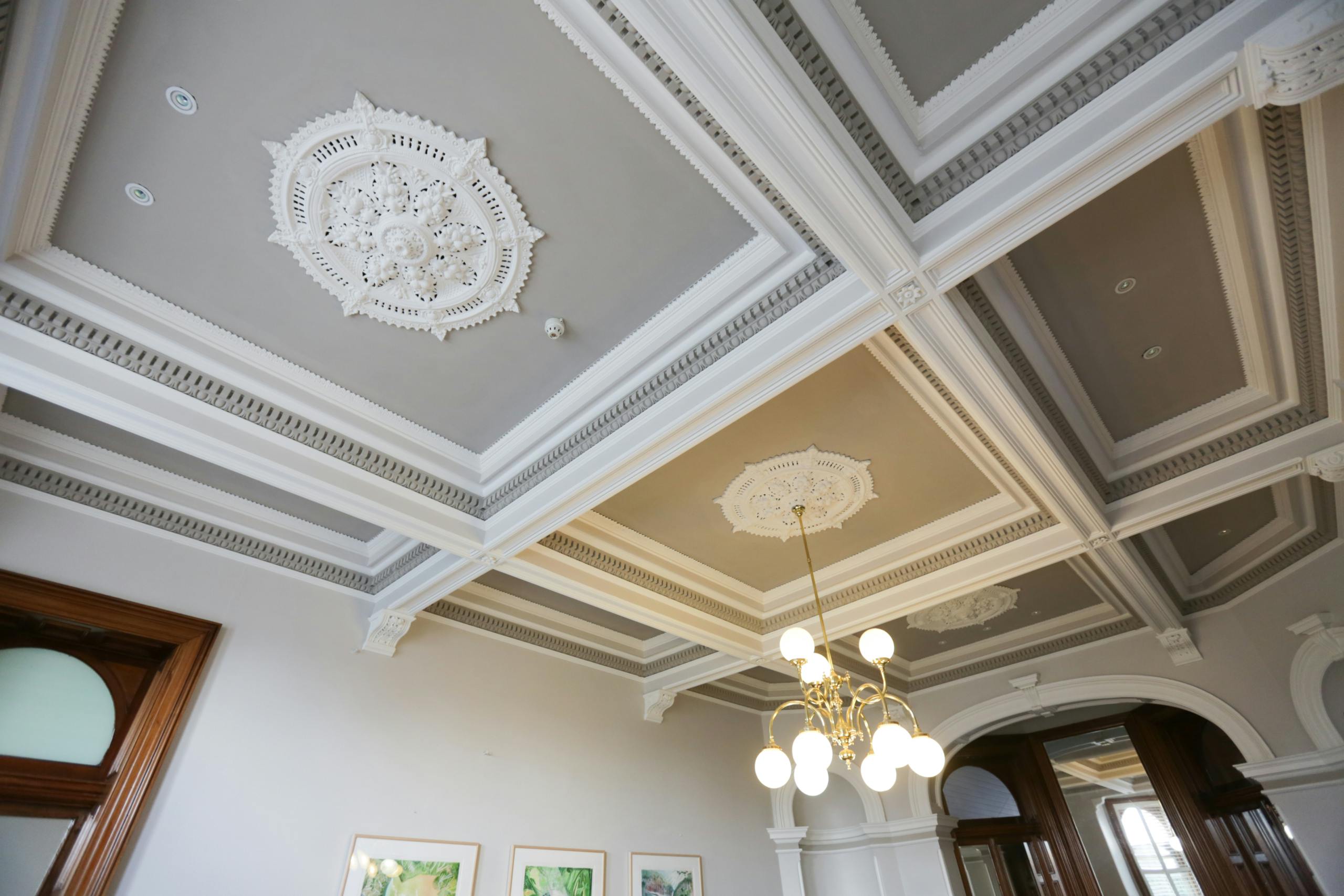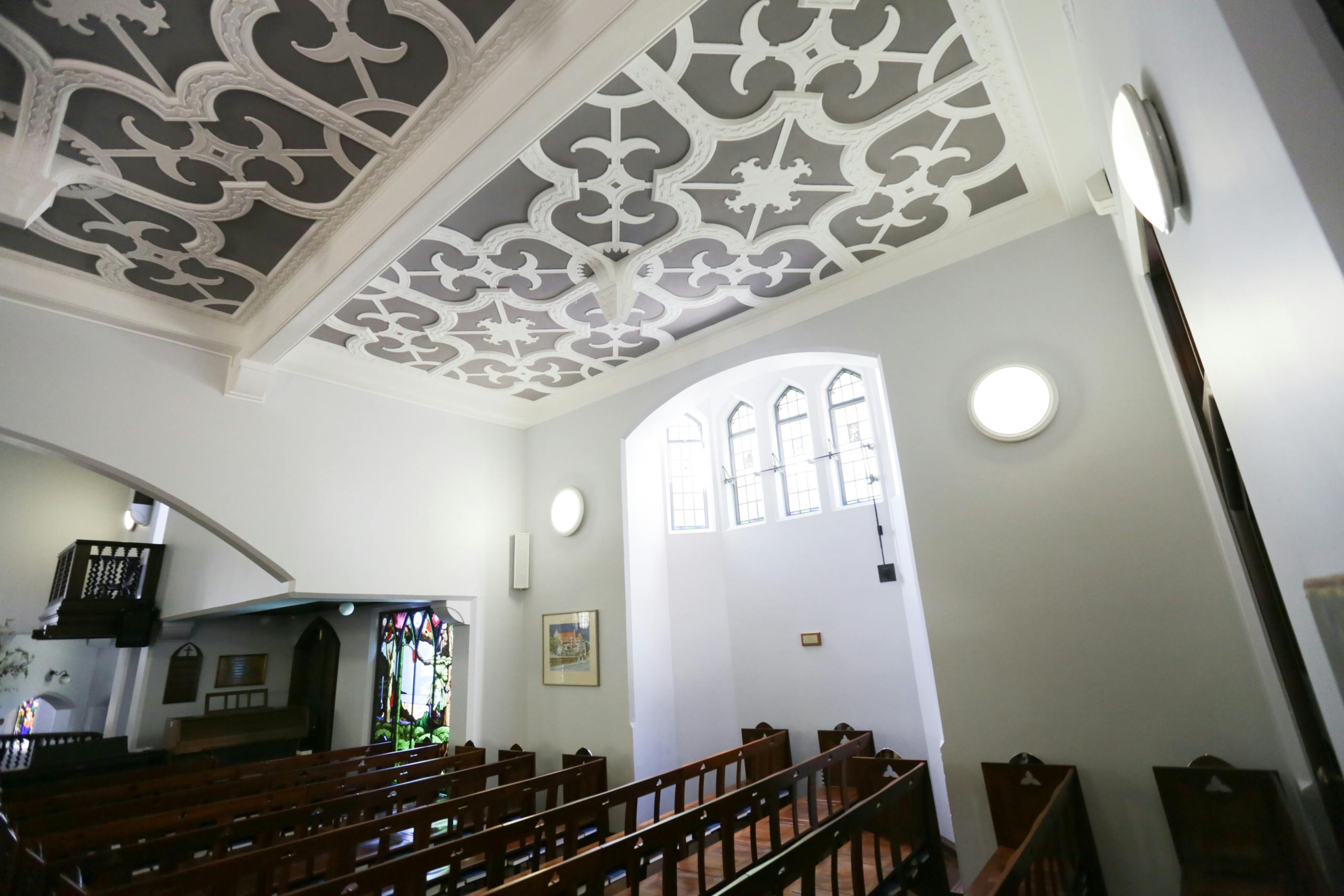 Over the years we’ve provided the school with quotes for different exterior and interior areas. One portion of work completed saw us painting the beautiful and ornate ceilings throughout the main building. Like on all of our many successful jobs we teamed up with a colour consultant from Rochele Decorating to give the client a colour scheme options. The options given were a simple and natural light choose or an option of out of the box. The client chose the out of the box option which resulted in the beautifully contrasted look of creamy white decorative molding against a darer grey. It was a brave choice by the school but the result is a breathtaking display of class which compliments the high ceilings, stained glass elements and dark wooden features.