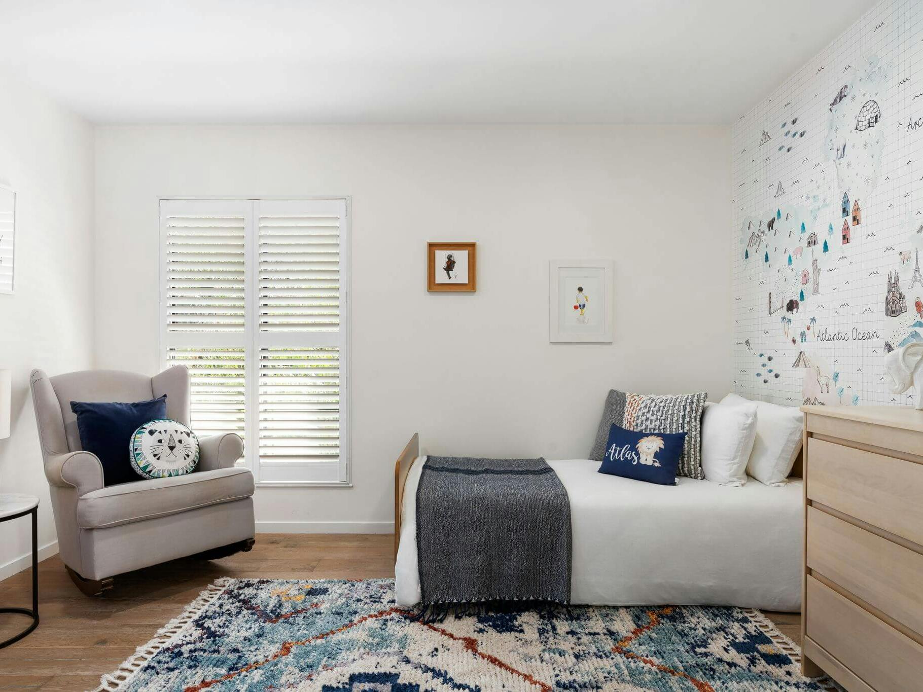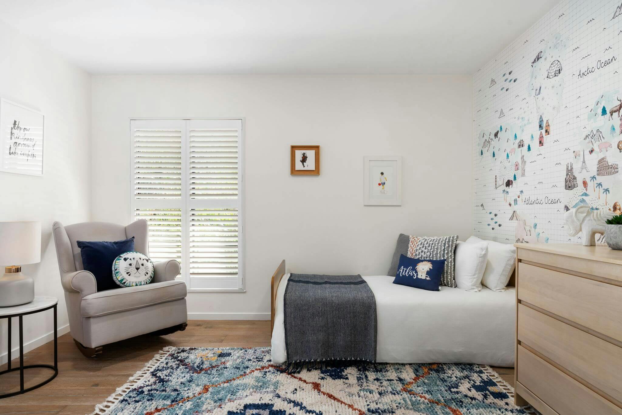 Internally this client also used our plastering service making a few adjustments to the layout of the property. On the exterior our rendering services were used to render the pool wall which was previously tiled, giving the pool area a brand new look. We also provided our wallpapering services to install some gorgeous wallpaper in one of the children’s bedrooms (featured in the pictures).